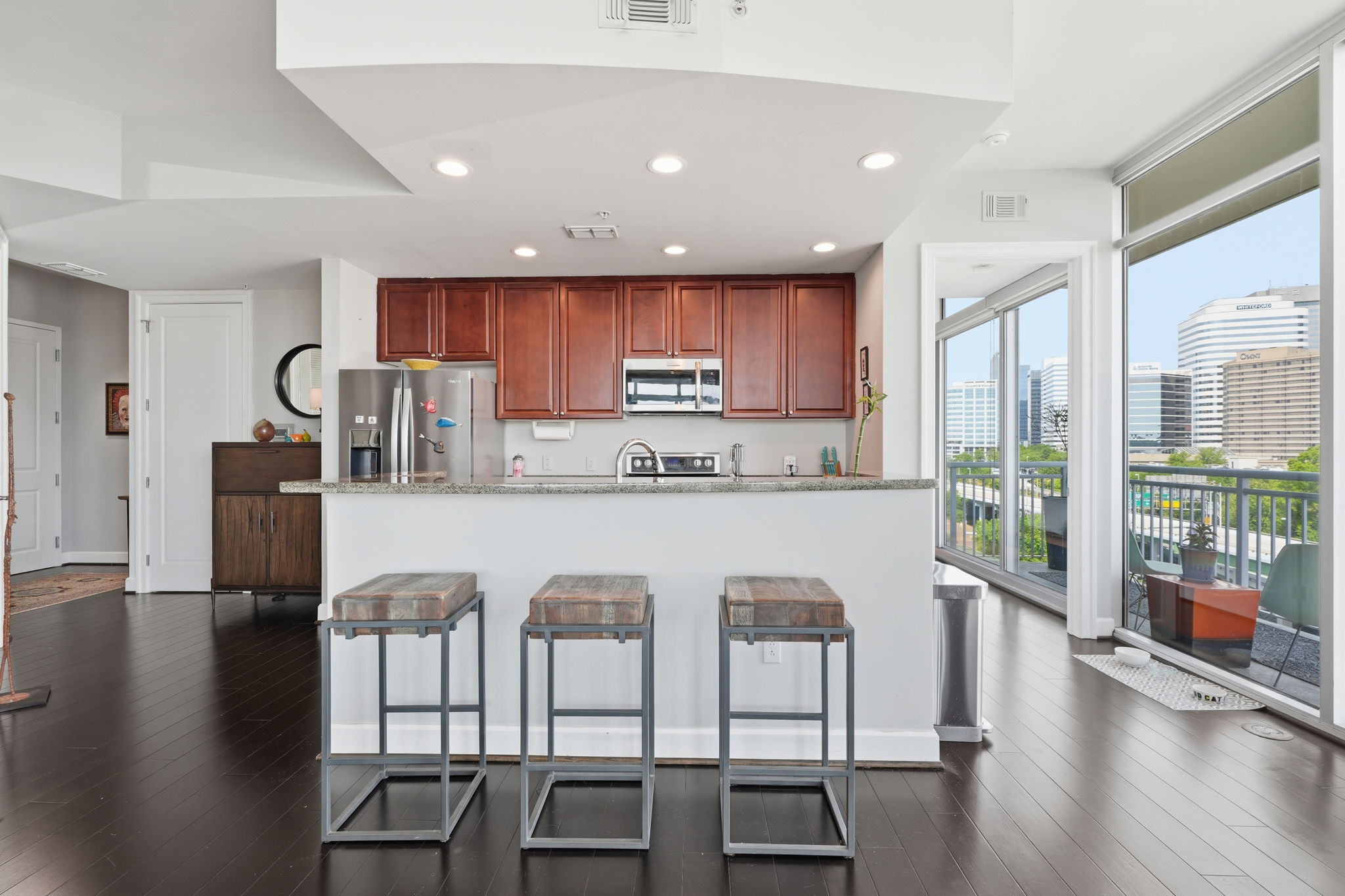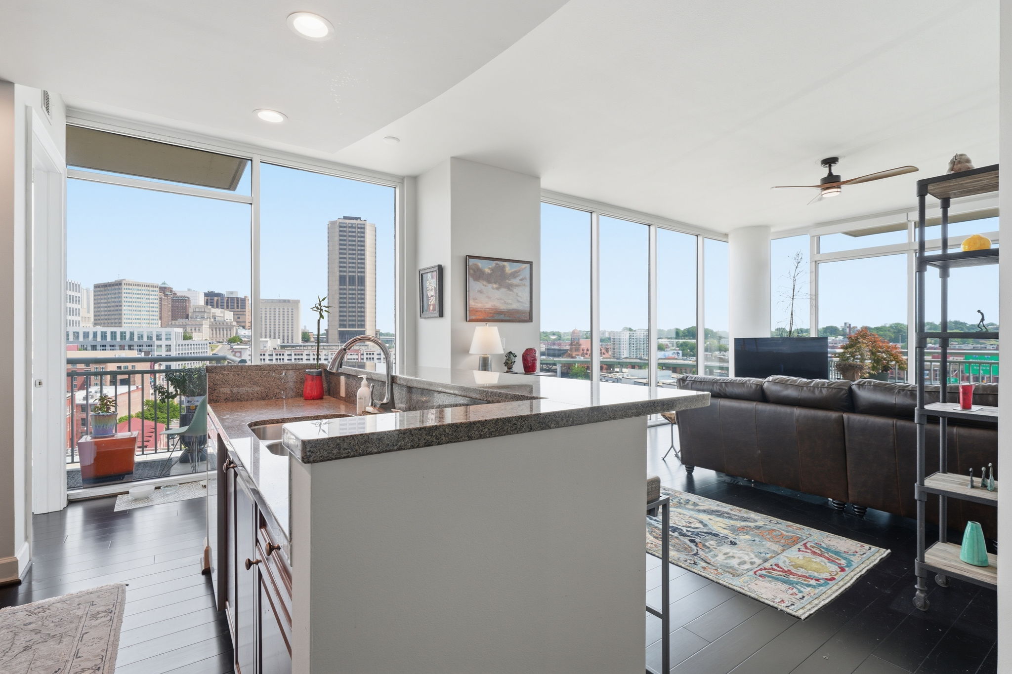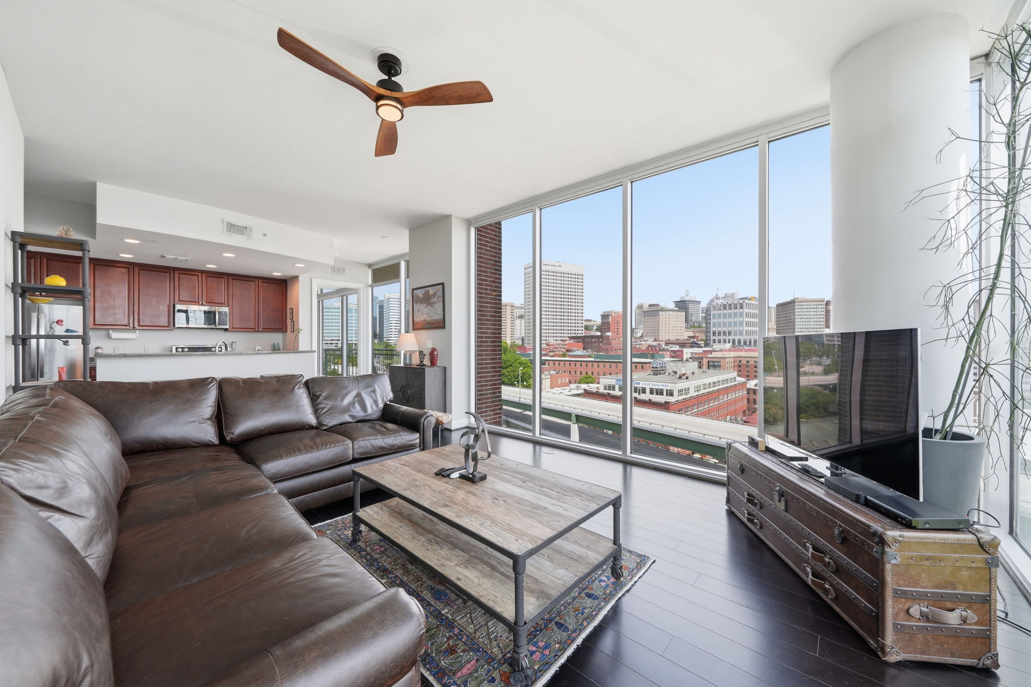 Downtown living at its best! This contemporary two bedroom condo yields uninterrupted stunning views with floor to ceiling windows. An open floor plan designed with generous living spaces, 10 ft ceilings, two balconies . The kitchen features granite counters, newer stainless appliances, cherry cabinets, island w/seating. A spacious primary suite features recently renovated inspired bath/closet combo with skyline views. The light-filled second bedroom has private bath access. Enjoy spectacular sunrises and dramatic downtown views. Watch the osprey and great blue heron fly by. New Heat Pump/Hot Water (2024). Two separate indoor parking spaces, 24 hr security/concierge, private club room, gym overlooking the Kanawha canal, plus internet/cable inc in monthly fee. Walk to restaurants, historic sites, shops. Plus Brown’s Island, T-Pot bridge, the James River park system, the Capital Trail and Allianz amphitheater are right outside your door!